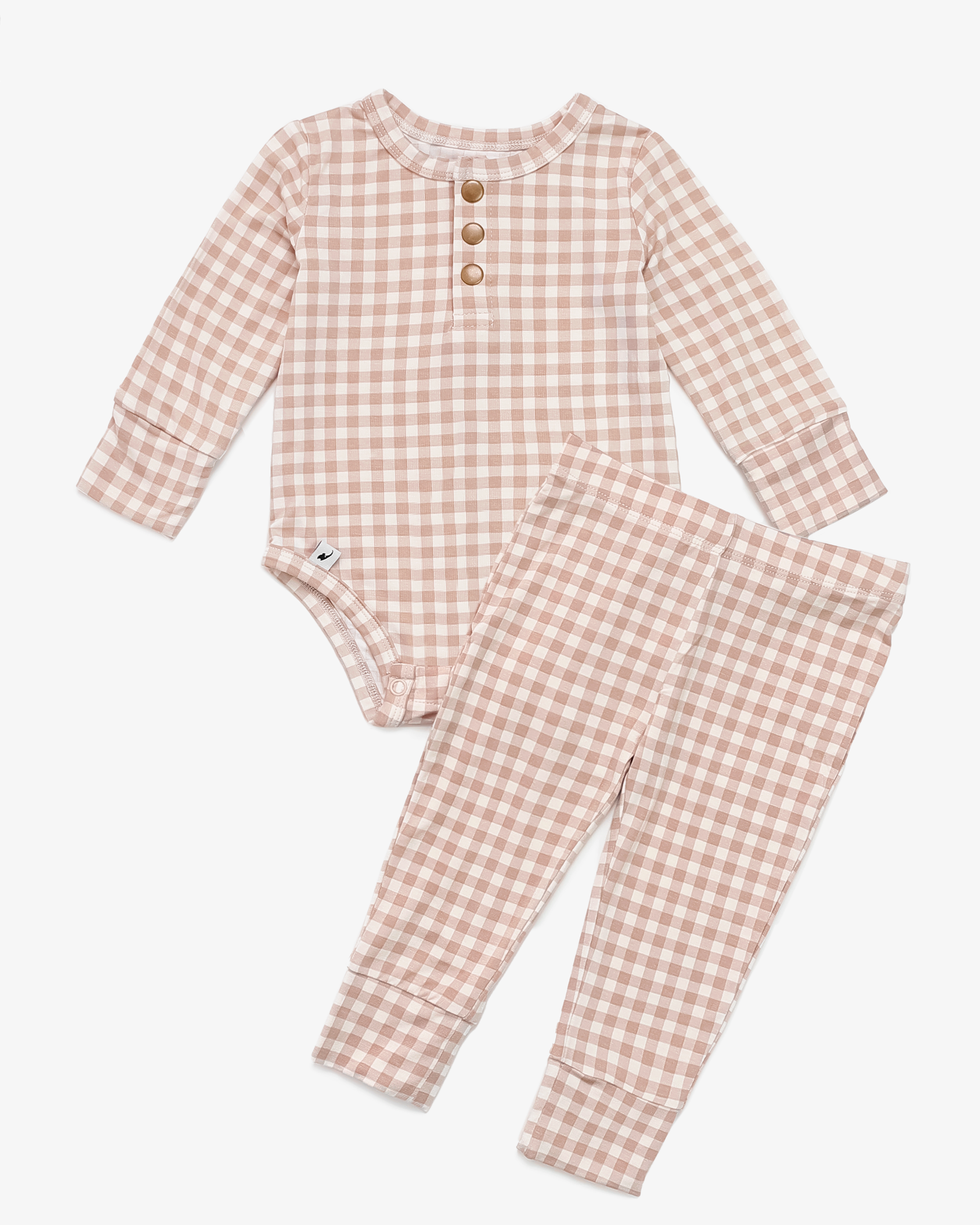 Our cozy two-piece sets are the perfect, effortless outfit. Babies love them because the fabric is silky soft, breathable, and stretchy. Moms love them because of how easy they are to put on and off. Functional snaps (no fumbling with buttons here!) on the tops and comfy bottoms. You get all the benefits of our bamboo/spandex fabric and sizes can easily go beyond normal range because of the stretchy fabric.